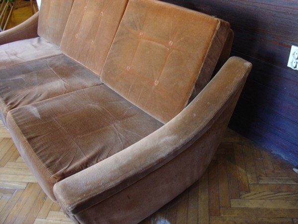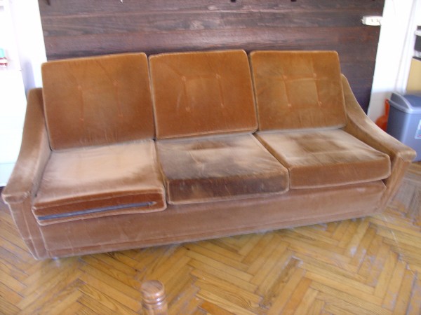 Podarimo star, rjav tekstilni kavč. Prevleke so na zadrgo, da se jih po potrebi sneti in oprati.