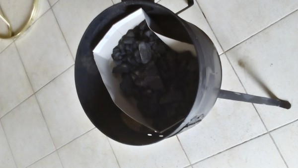 Pekač za pečenje zunaj, peče se na pladnju meso z dodanim oljem, pečeno se odlaga na zunanji rob. Zraven je še nekaj oglja. Lokacija CELJE.
