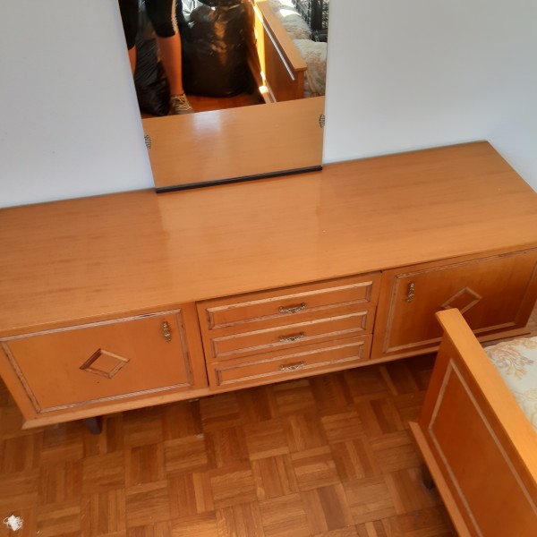 V kompletu podarimo spalnico: posteljo z dvema ohranjenima enojnima jogijema (skupna dolžina 200×180), dve nočni omarici, predalnik (dolžina cca 120 cm), velika garderobna omara. Pogoj lasten prevoz.
