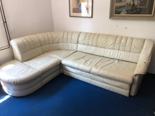 Podarimo raztegljivo kotno usnjeno sedežno garnituro dimenzije cca. 1300 x 2300 mm (levi del je počivalnik, desno je dvosed).