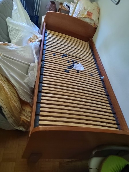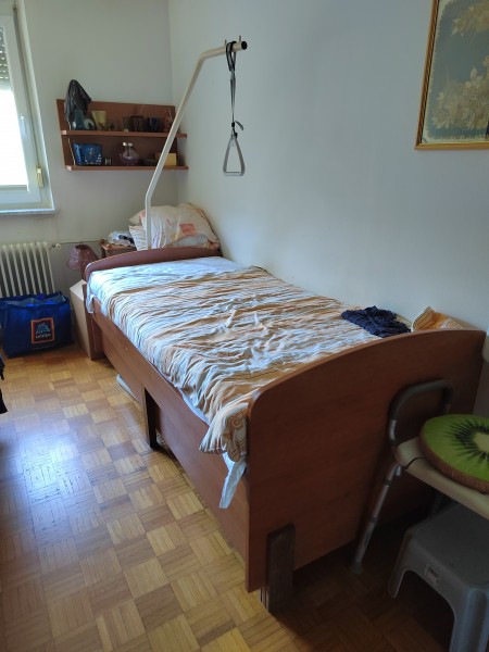 Dobro ohranjena postelja dimenzij 2 x, 0, 9 x 0,5 m. Zraven pride tudi vzmetnica. Trenutno je sicer prilagojena za osebe z gibalno oviranostjo, vendar lahko stojalo z ročajem nad posteljo lahko odstranimo.
