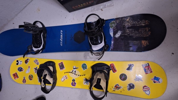Podarim 2 snowboarda na sliki z vezmi. En je elan, starejši "powder" mode - supre dila je bila to včasih, drugi je otroški za začetnike.