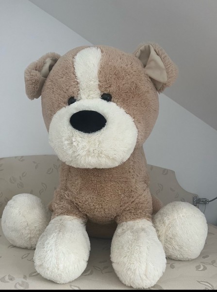 Plišast pes svetlo rjave in bele barve, s črnim nosom in očmi. Visok je 75cm.