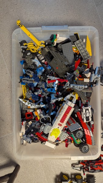 Lego technichs in običajne lego kocke - nekaj sestavljenih in nekaj ne.