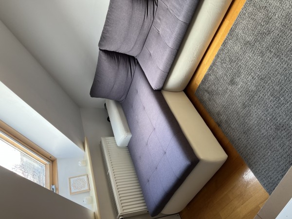 Kotna sedežna garnitura. Kombinacija blaga in skaj usnja. Dimenzije: 250cmx90cm. Podaljšan del dimenzije 180 cm. Možno je raztegniti v ležišče.