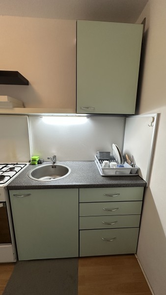 Zeleno siva kuhinja z umivalnikom in pipo.Pult je sive barve 120cm x 69cm, viseča omarica 60cmx78cm.