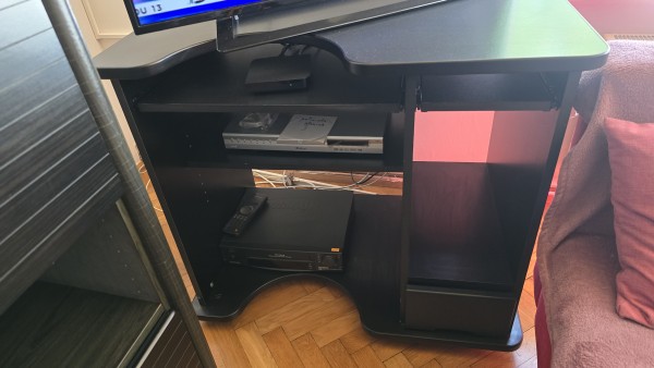 Temna. Dimenzija 188x45x118. Ni poškodovano. Računalniška mizica, prav tako dobro ohranjena. Nepoškodovana.