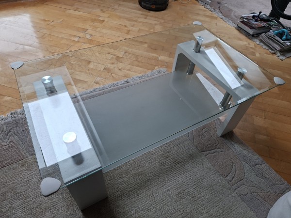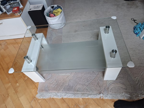 Bela klubska mizica s steklom. Na robovih so ščitniki, ki se jih lahko odstrani. Steklo je celo.