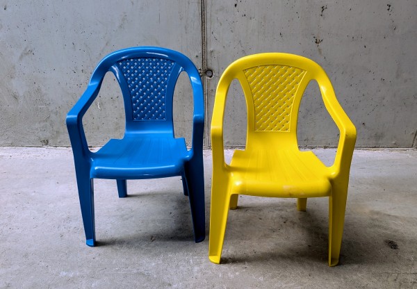 Podarim dva plastična otroška stolčka. Prvi je rumene, drugi modre barve kot prikazuje priložena fotografija.