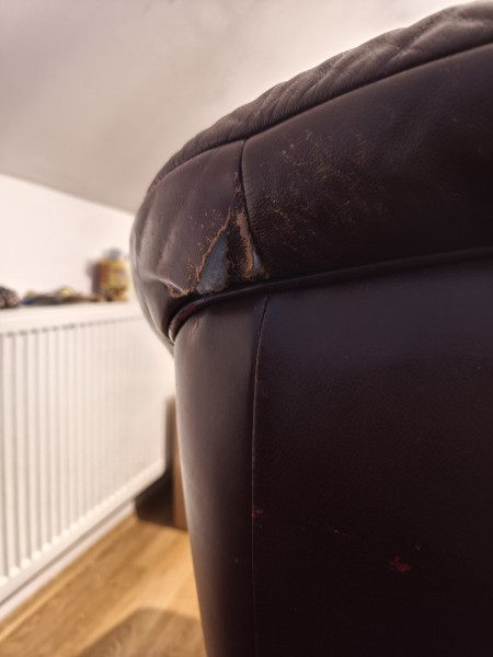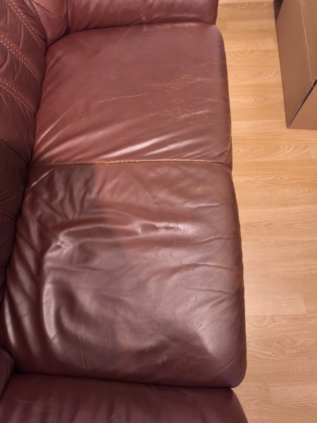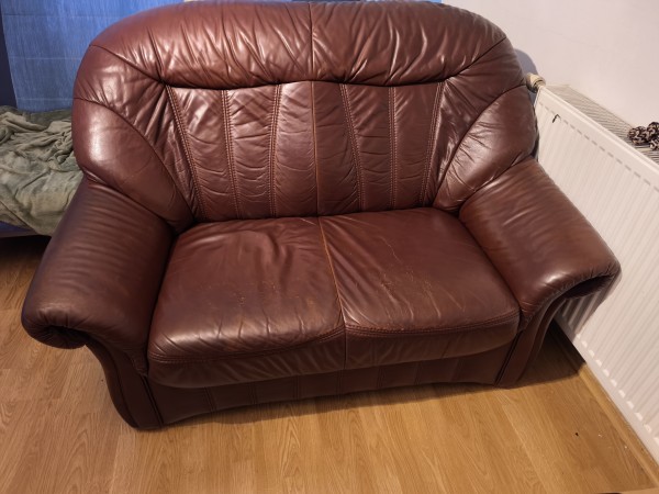 Rabljen dvosed, vidni znaki uporabe - sedalni del, naslon in nasloni za roke. Ena poškodba zadaj.