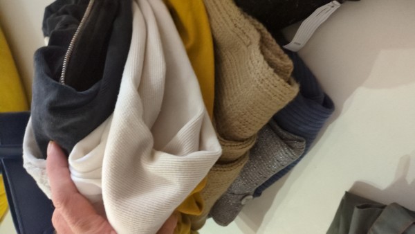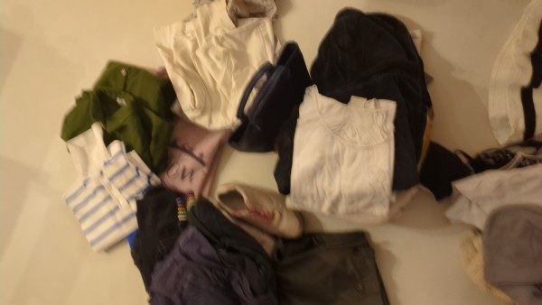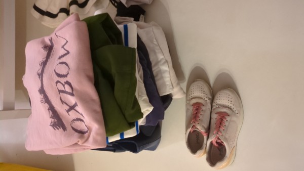 Čista oblačila, ki so bila razvrščena: majice, nogavice, kopalke, hlače.čevlji številka 36.