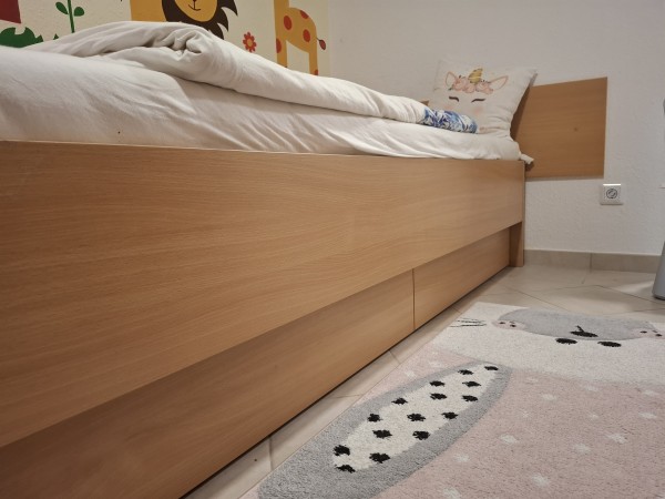 PODARIMO. Postelja: 90x200 stara le 3 leta. Podarimo jo brez spodnjih dveh predalov in brez letvic in brez vzmetnice. Zraven je tudi stenska lesena obloga.