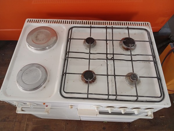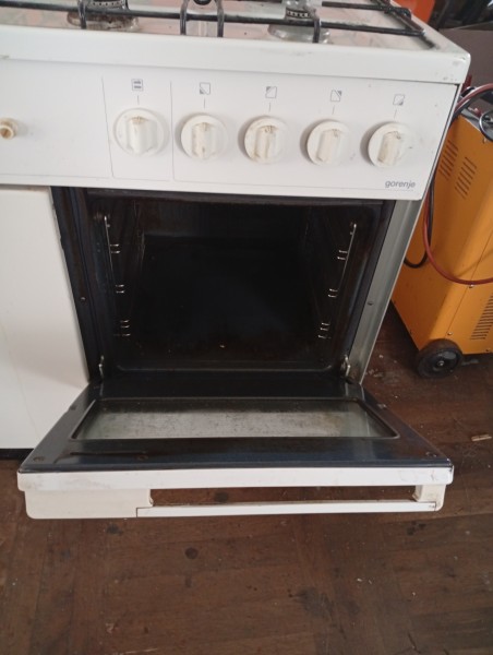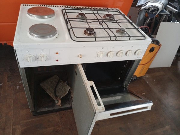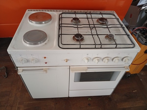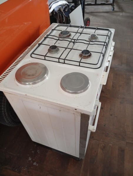 Starejši delujoči plinski štedilnik s pečico 4xplin,2x elektrika, elektronski vžig ne deluje.Dim.90x60x85cm.