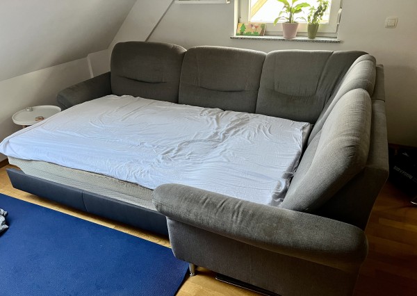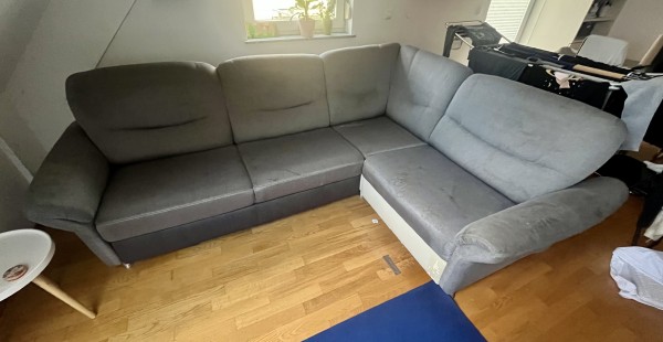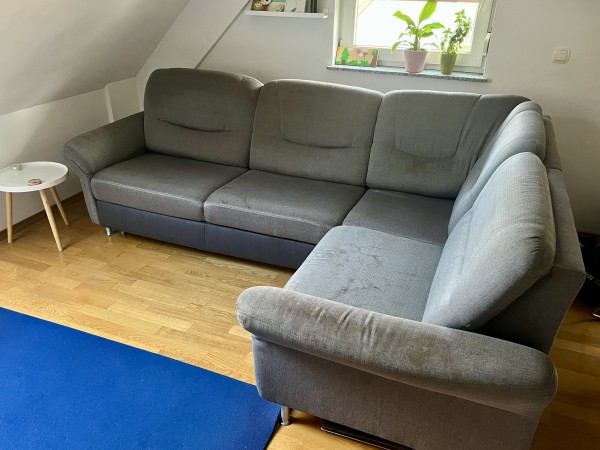 Podarim brezhibno sedežno garnituro kot na sliki, pribliznih dimenzij 190 x 260 cm. Ima izvlečno ležišče in predal. Na novo tapecirana pred nekaj leti.