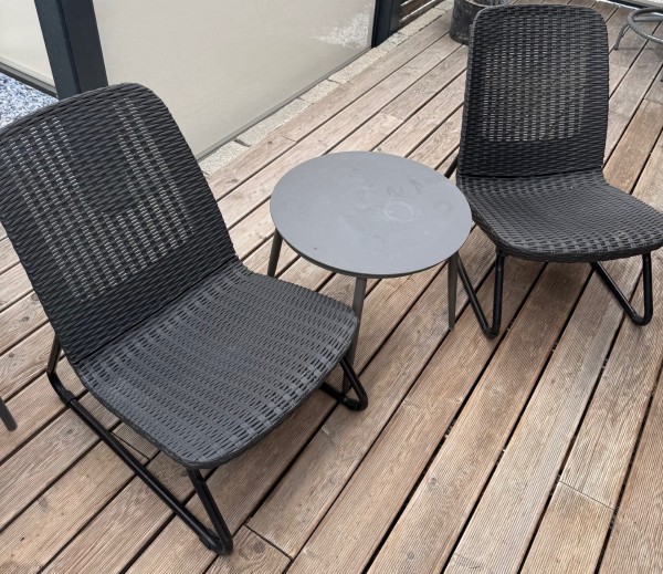 Stol in miza antracit barve kombinacija kovine in plastike.