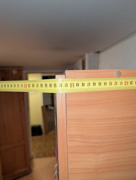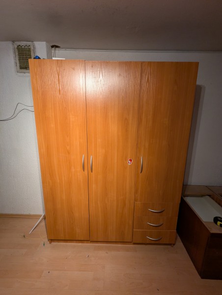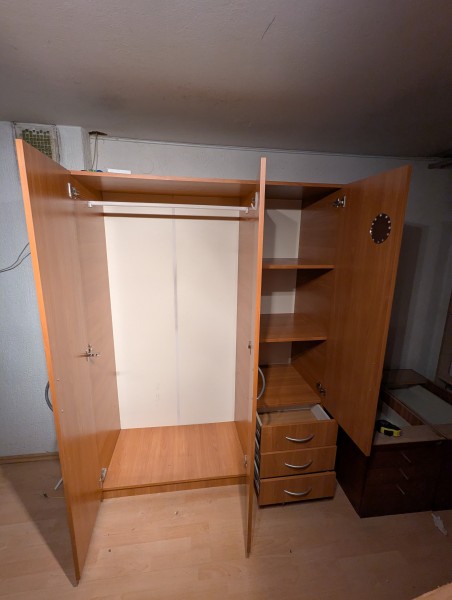 Starejša, solidno ohranjena garderobna omara, za hrambo oblačil. Levi širši del za obešanje oblek, desni ožji za hrambo na policah in v treh predalih. Ker je bila omara postavljena v pritličju starejše hiše ima blag vonj po vlagi. Morda bolj primerna za ne bivalni prostor. Verjetno bi se jo dalo predelati in dodati police.
