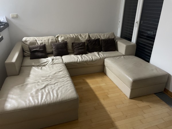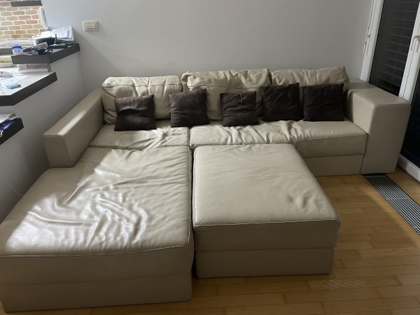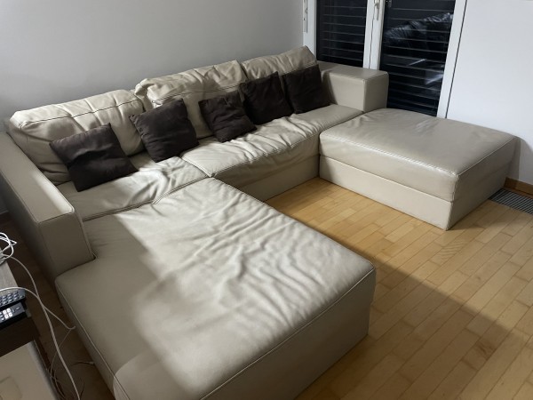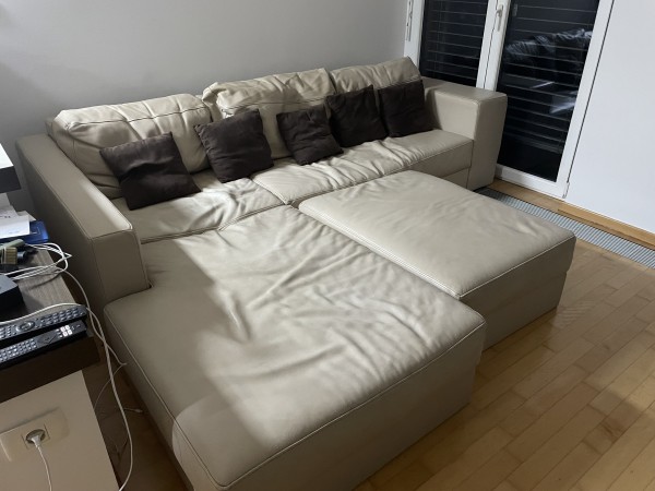 Usnjen kavč, bež barve, dimenzije 2,9m x 2,10. Tabure 0,7m x 1m.- osebni prevzem.