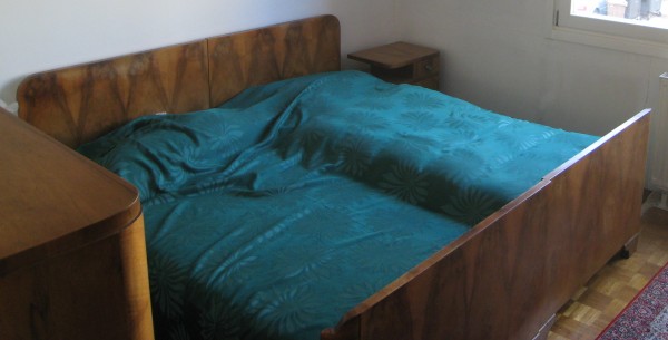 Razstavljena lesena zakonska postelja z vzglavjem in strankino (rob na dnu postelje) v zelo dobrem stanju, temno rjave barve.
