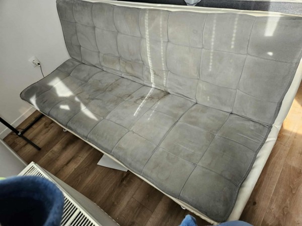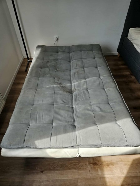 Sivo moder kavč, ki se raztegne v ležišče za eno osebo ali dve, če je treba.