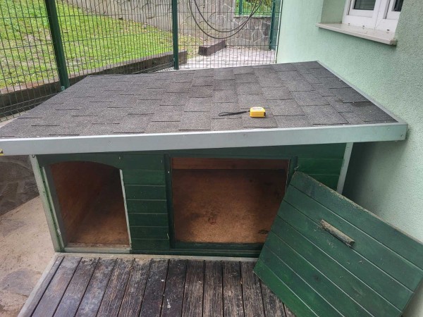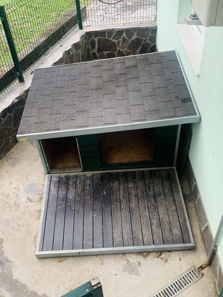 Dolžina 180 cm, globina 130, višina 100. Lesena. Je izolirana.zraven damo tudi prag. Je primerna za večjega psa.