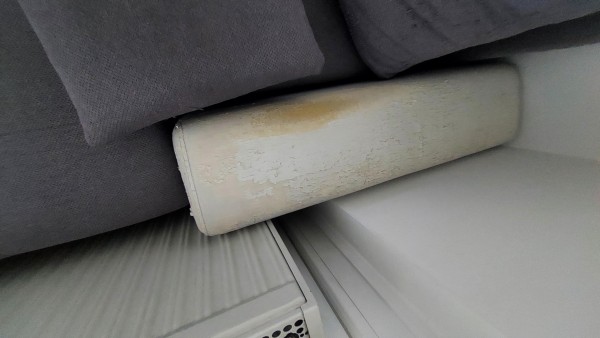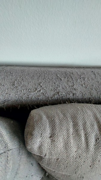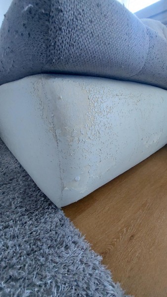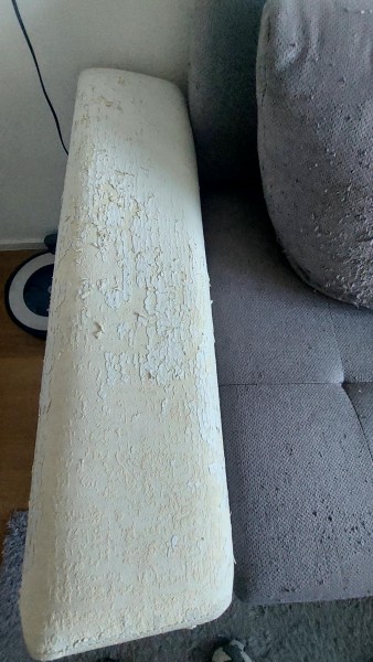 Sedežna je spraskana od mačjih krempljev, na delih kjer je umetno usnje, se lušči.