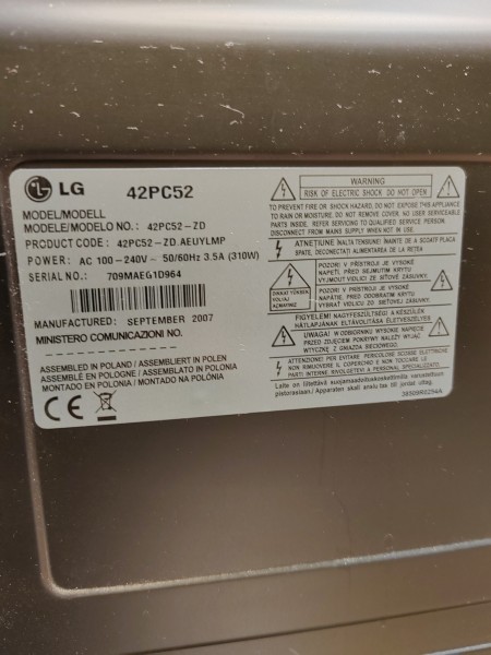 Televizor, delujoč plazma, brez daljinca, vendar delujoč s tipkami na TV-ju. Ni lahek, (29kg) vendar brezhiben in zanesljiv. S podstavkom.