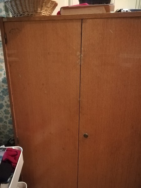 Dobro ohranjena omara, z lesenimi policami in dvokrilnimi vrati. Originalno za pisarno.