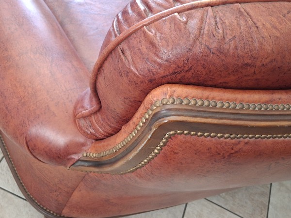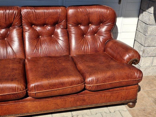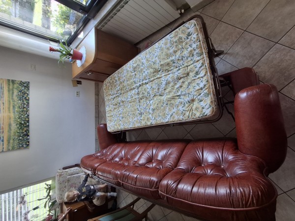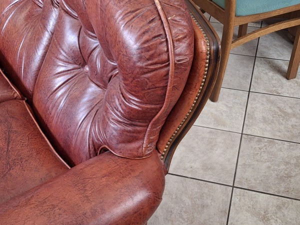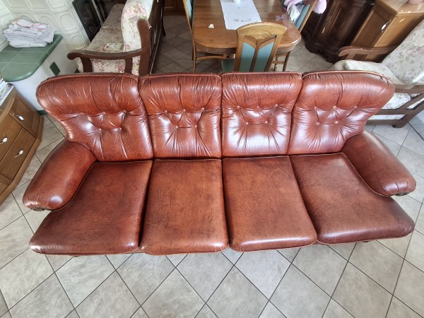 Odlično ohranjen rdeč usnjen trosed skupne dolžine 240 cm z vgrajenim ležiščem.