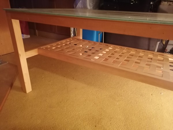 Lesena mizica s stekleno plosco in mrezasto polico, sirine 118 cm, sirine 70 cm in visine 50cm.