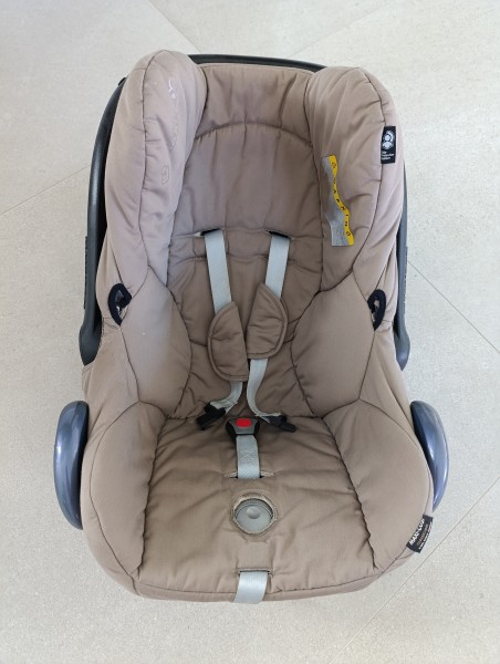 Lupinica Maxi cosi v bež barvi. Pripenjanje s pasom. Popravljena strehica, drugače b.p.