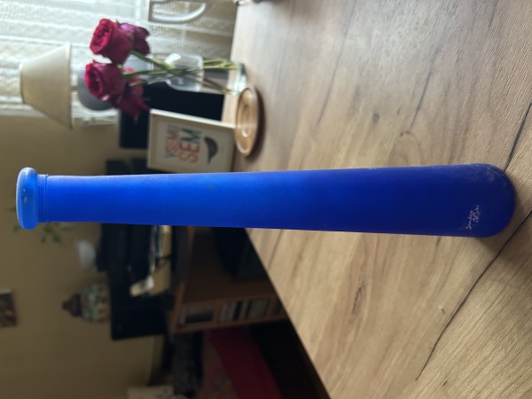 Ozka, visoka, pariško modra steklena vaza za en cvet, elegantna, mlečno steklo, višina: 30 cm.