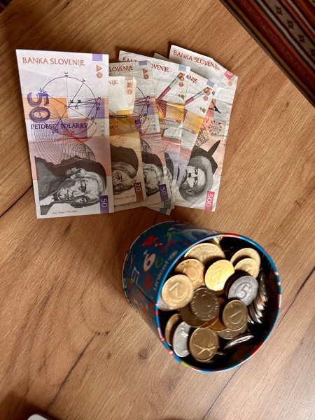 Slovenski tolarji - bankovci in cel hranilnik mešanih kovancev, največ tolarjev, nekja kun in ostalo.