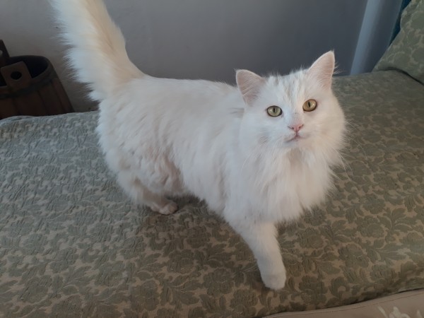 Podarimo belo dolgodlako muco pisanih staršev, ki je vajena hišnih pravil, pa tudi zunanjih radosti. Stara je 6 let, prijaznega, sprva previdnega in včasih samosvojega značaja. Uživa v hrani, še rajši pa v božanju. Je sterilizirana, osnovno cepljena, tretirana proti notranjim zajedavcem in brez vidnih zdravstvenih težav. Žal ne moremo več primerno skrbeti zanjo zaradi sosedskih nesporazumov. Po dogovoru lahko muco tudi pripeljemo.