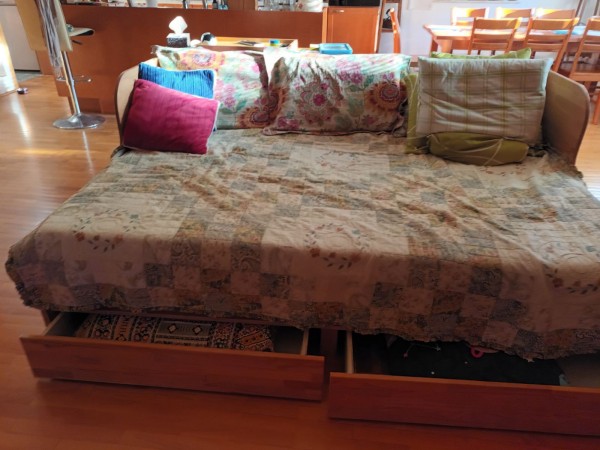 Podarim posteljo z vzmetnico, velikosti 140x200, 3 velike vzglavnike s prevlekami. Postelja ima dva izvlečna predala.