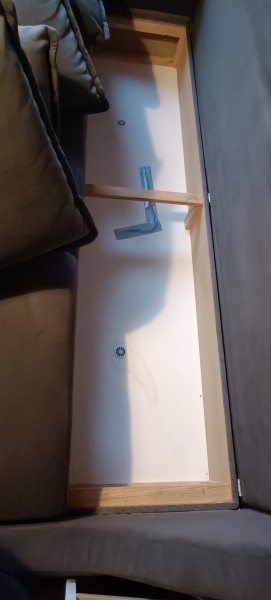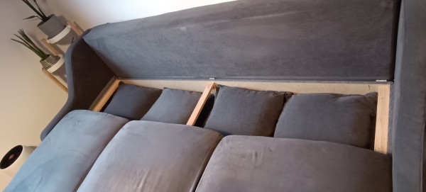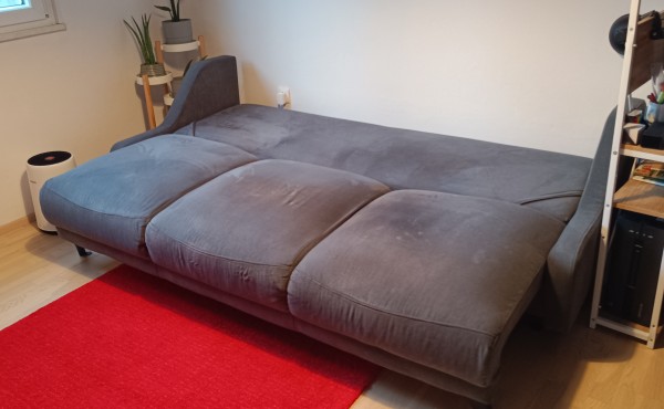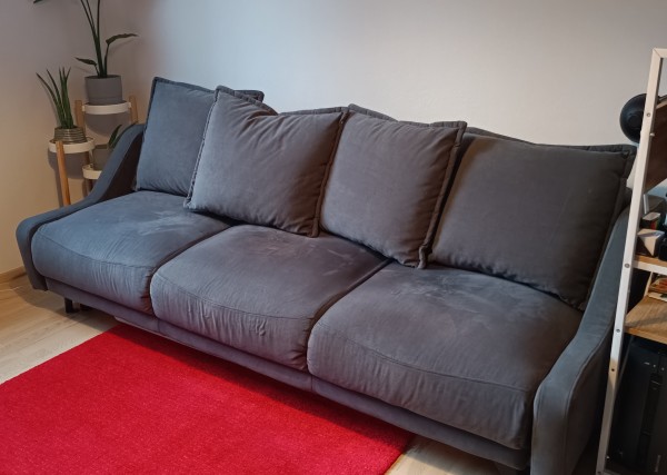Dobro ohranjen kavč, star 3 leta. Edina poškodba je na notranjem predalu za hrambo posteljnine (počeno in zalepljeno). Kavč je popolnoma funkcionalen, ta poškodba se ne vidi.