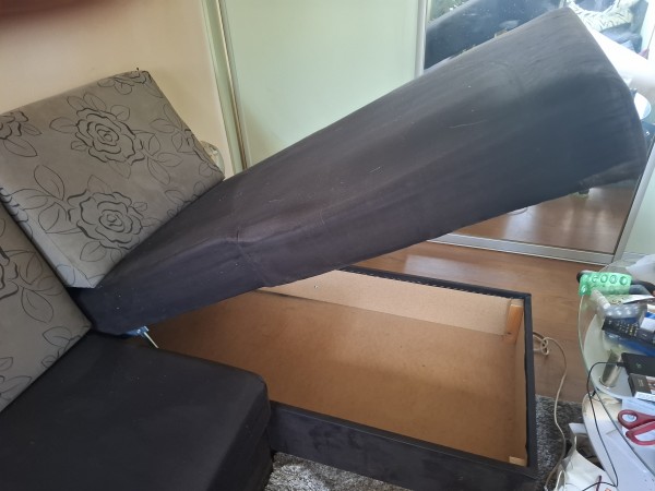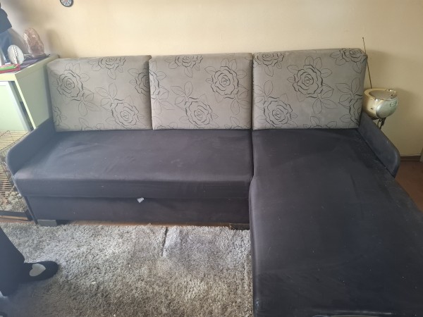 Podarim trosed v črno sivi barvi, trosed je ohranjen, s posteljno funkcijo ter predalom za shranjevanje posteljnine.