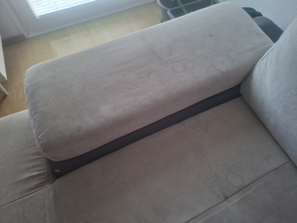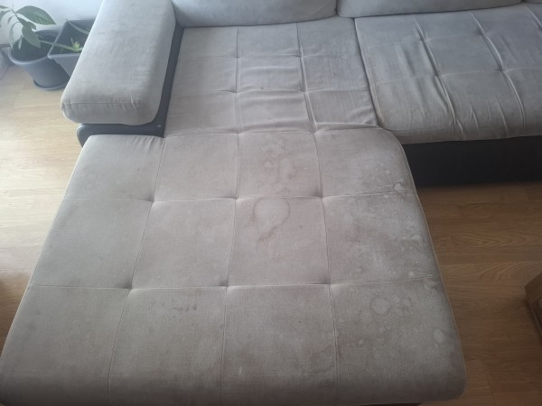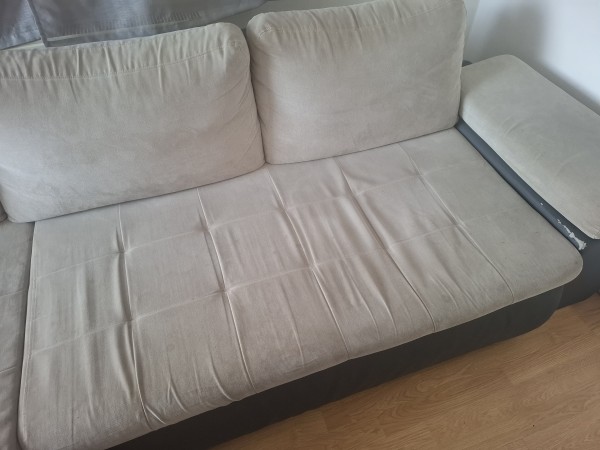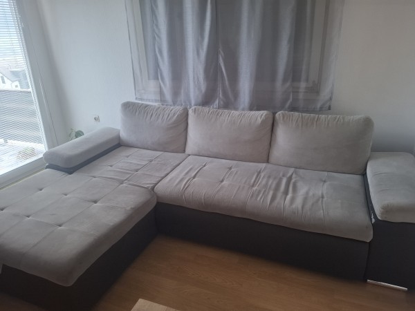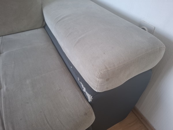 Ima raztegljivo ležišče in priročen predal za shranjevanje. Garnitura je obrabljena in umazana, zato je primerna za koga, ki obnavlja ali predeluje stare kose pohištva.