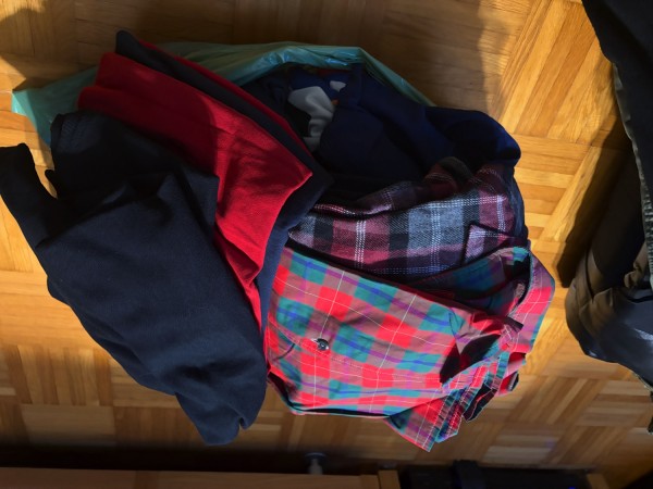 Nabrano iz omare - mešanica oblačil različnih velikosti. Tudi nekaj hlač je zranen, pižame, ... Primerno za družino. Kar se velikosti tiče so moške stvari XL, ženske M ali L, otroške za otroke stare 8-14 let.