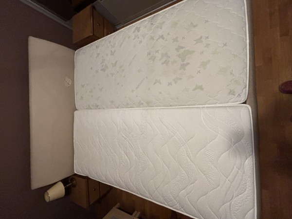 Postelja je rabljena, cela, v 3 kosih (vzglavje, okvir, kovinski okvir).