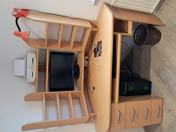 Računalniška miza je kotna: 105x105cm. Poličnik: 44x30cm. Omarica: 30x63cm.