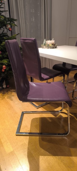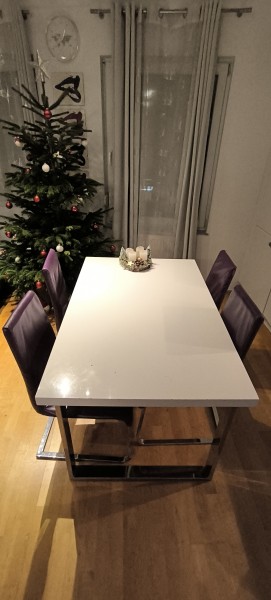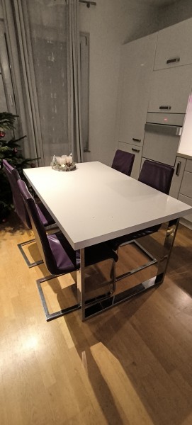 Podarimo jedilno mizo dimenzije 140x90cm in 4 stole. Miza je odrgnjena, a masivna. Stoli prav tako obrabljeni, a trpežni in uporabni. Stoli: vijolično umetno usnje.