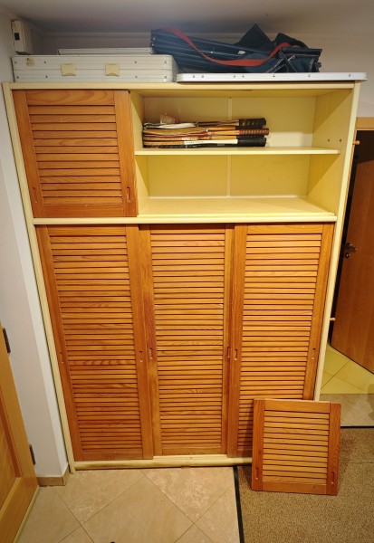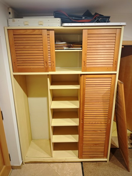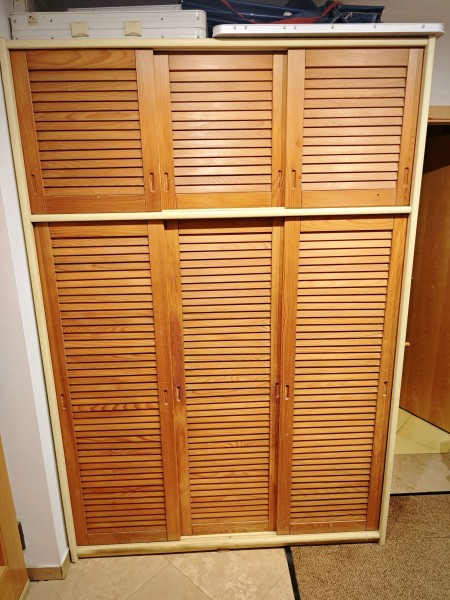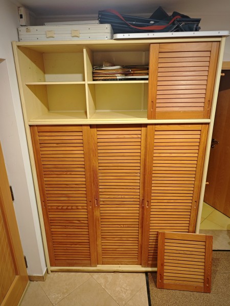 Podarrim starejšo tridelno garderobno omaro z lesenimi drsnimi vrati, ki se enostavno snamejo. Stranice so iz iverala.
