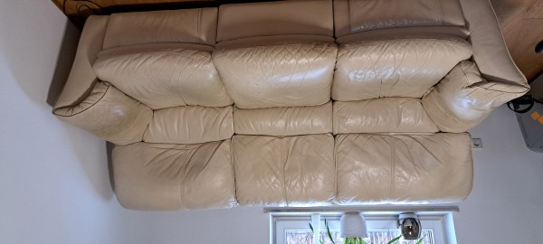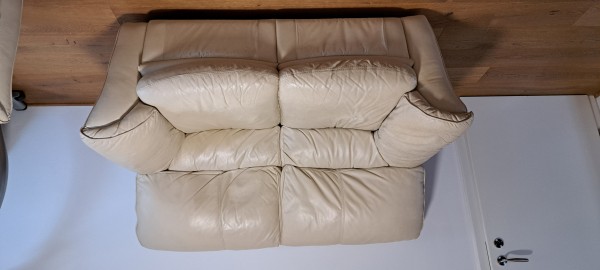 Usnje delno poškodovovano na sedežnem delu troseda.Starejša sedežna ima po dva mehansko odpiranje počivalnika na trosedu in dvosedu.Starost več kot 15 let, srednje ohranjena usnje bež barva.