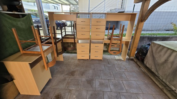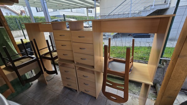 5 pisalnih miz s stoli.rabljeno, brez vidnih poškodb, podarim , odpelji sam.