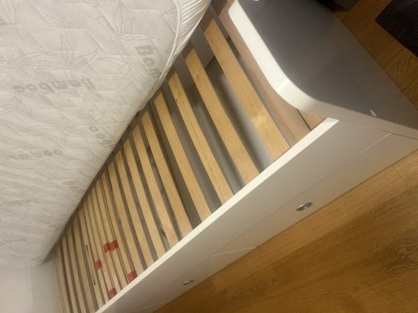 Podarim lepo ohranjeno posteljo v beli barvi, s 3 predali za shranjevanje. Poleg postelje tudi vzmetnice in jogi. Dimenzija 90x200cm.