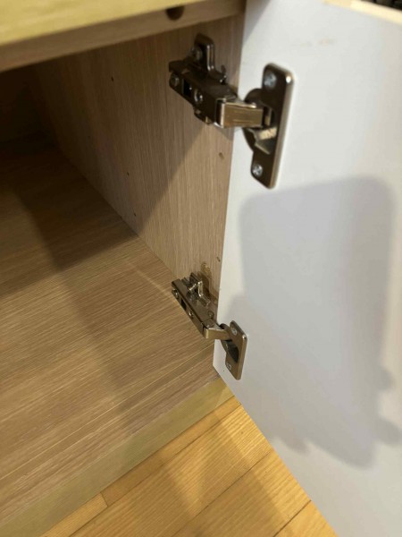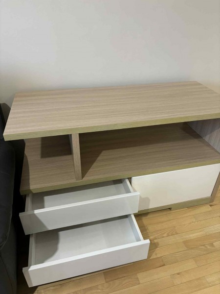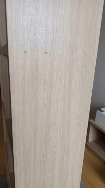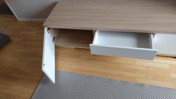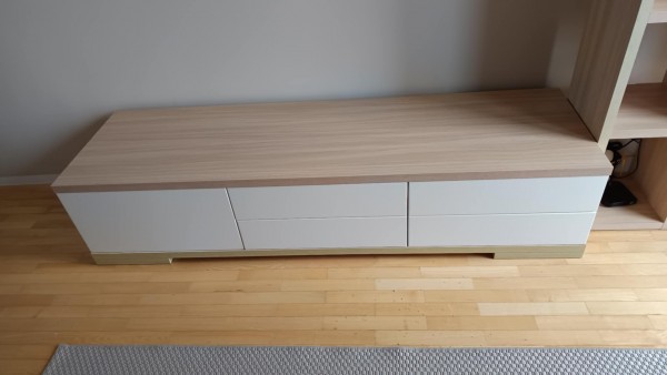 Krajša tv omarica potrebuje popravilo pritrdišča tečaja krila omarice. Na satju so na strani ob steni vidni z lesarskim kitom zapolnjeni deli, kjer se je nekoč držal podaljšan del satja.