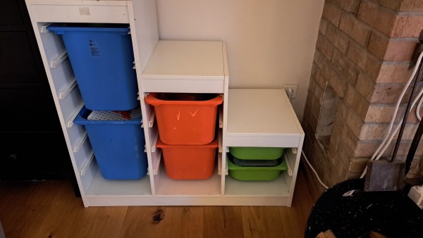 Bela omara za igrače z pripadajočimi škatlami. Dobro ohranjena. Prevoz uredite sami.
