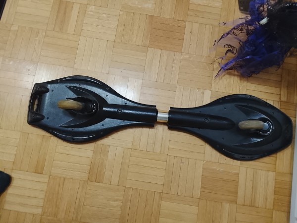 Dobro ohranjena rolka za otroke na dveh kolesih in čarobna metla z zvočnim efektom.