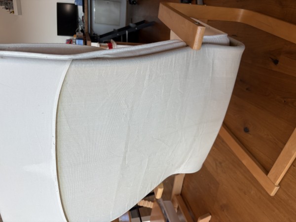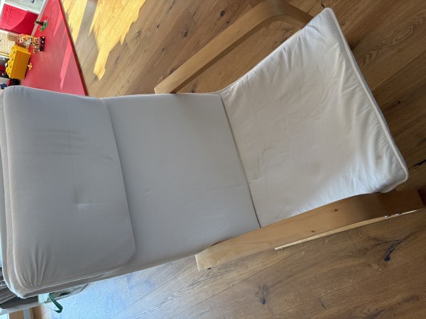 Ikea stol Poang, osnovni, prevleka iz blaga krem-bele barve. Star okoli 12 let, zadnja leta ni v uporabi, spravljen v kleti (brez kake vlage ali česa podobnega).