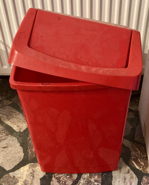 Plastični koš za smeti rdeče barve, velikosti 30x25x52 cm, s pokrovom z loputo.